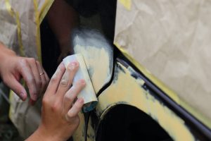 パテが完全に硬化するまで数時間待ちます。自然乾燥が原則です。硬化後、研磨作業に移ります。研磨は仕上がりを決定づける最重要工程です。まず320番程度の耐水ペーパーを「サンディングブロック」(当て板)に付け、盛り上がったパテの大まかな形を整えます。ブロックを使うことで均一な力で平滑な面を削り出せます。