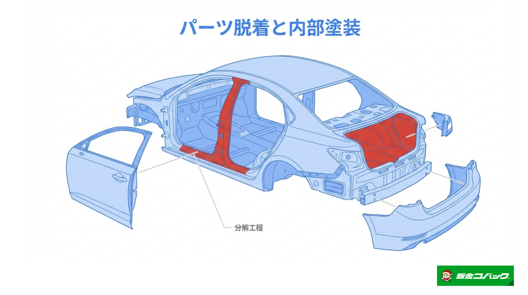バンパー、ライト、ドアノブ、モールなどを取り外して塗る方法。パーツの裏側まで塗装が回り込むため、仕上がりが非常に美しく、剥がれにくい。手間がかかる分、高額になる。
