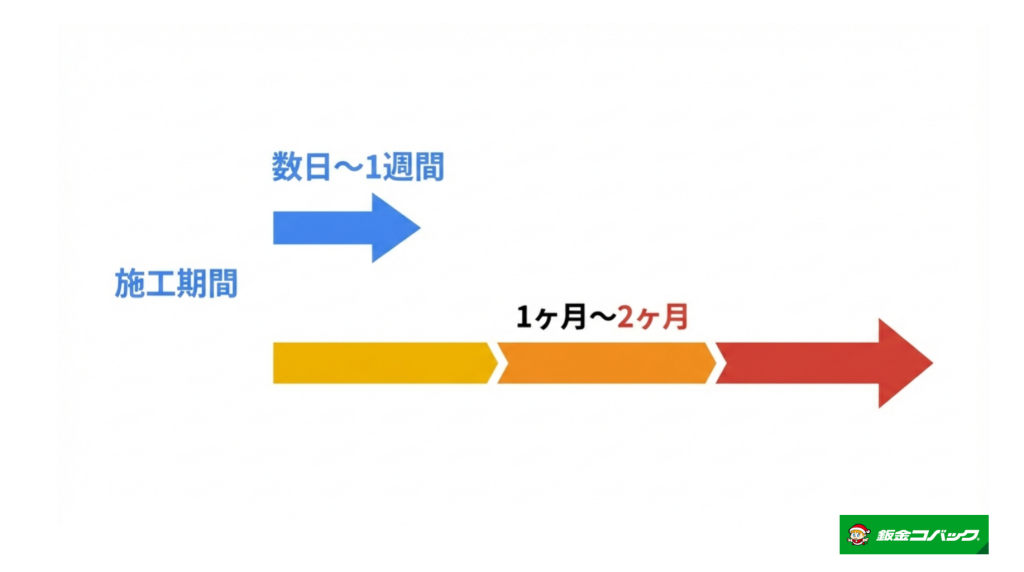 以下に、施工タイプ別の期間目安と、期間が延びる要因をまとめました。