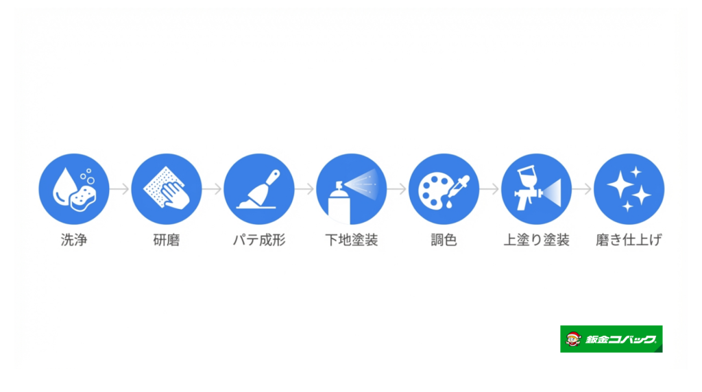特に「調色」や「パテ成形」は、AIや機械には代えられない熟練の技が必要です。コバックなどの簡易補修が得意な店舗では、この工程の一部(例えばバンパーを外さずに塗る、塗装範囲を極小にするなど)を効率化することで、低価格を実現しています。