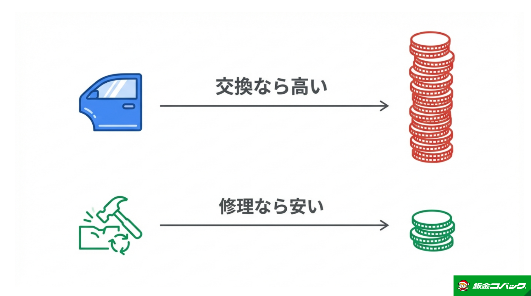 この違いを知らないと、「小さな傷なのになんで塗装代がこんなに高いの?」という疑問が解消されません。