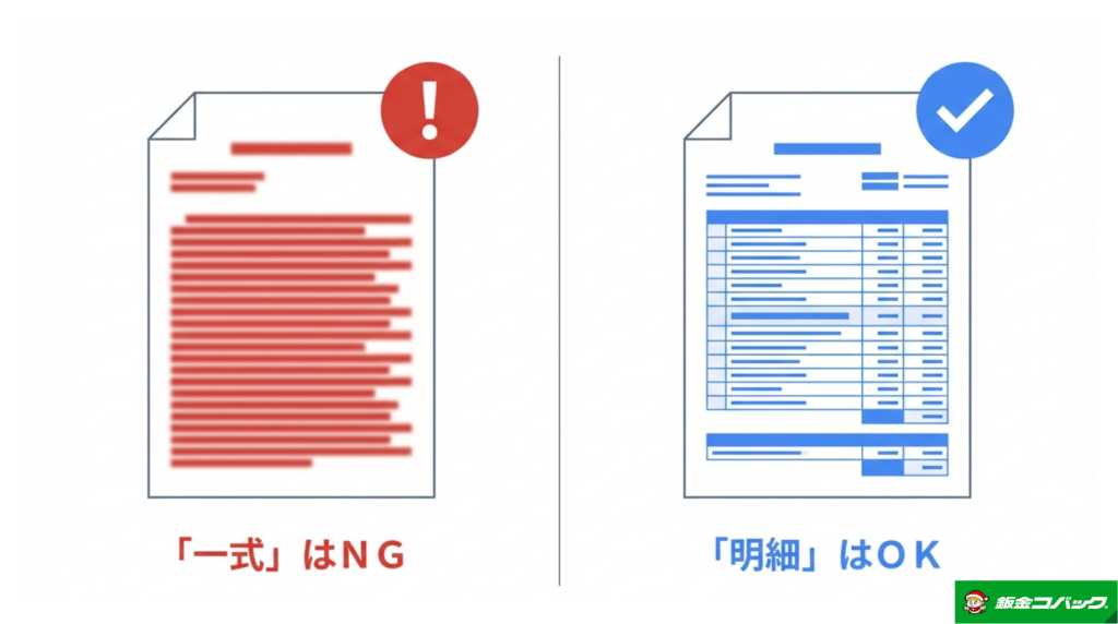 もちろん、全ての「一式」が悪ではありません。例えば、「クリップ一式 1,000円」のように、数百円の細かい部品をまとめる場合に使われるのは合理的です。しかし、数万円単位の項目で「一式」が使われている場合は要注意です。