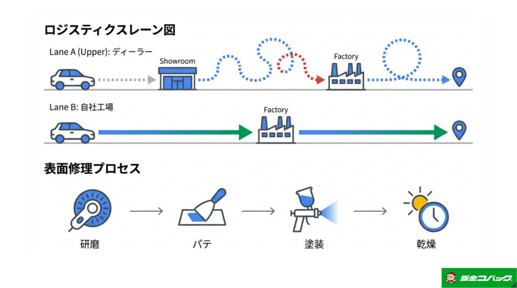 修理を急ぐ場合に最も重視すべきは、その店舗が「認証工場や指定工場を併設しているか」という点です。ディーラーの場合、受付は窓口で行いますが、実際の板金作業は提携している協力工場へ車両を回送することが少なくありません。この「移動時間」と「外注先との調整時間」だけで2〜3日を要することがあり、結果として総納期が延びてしまいます。