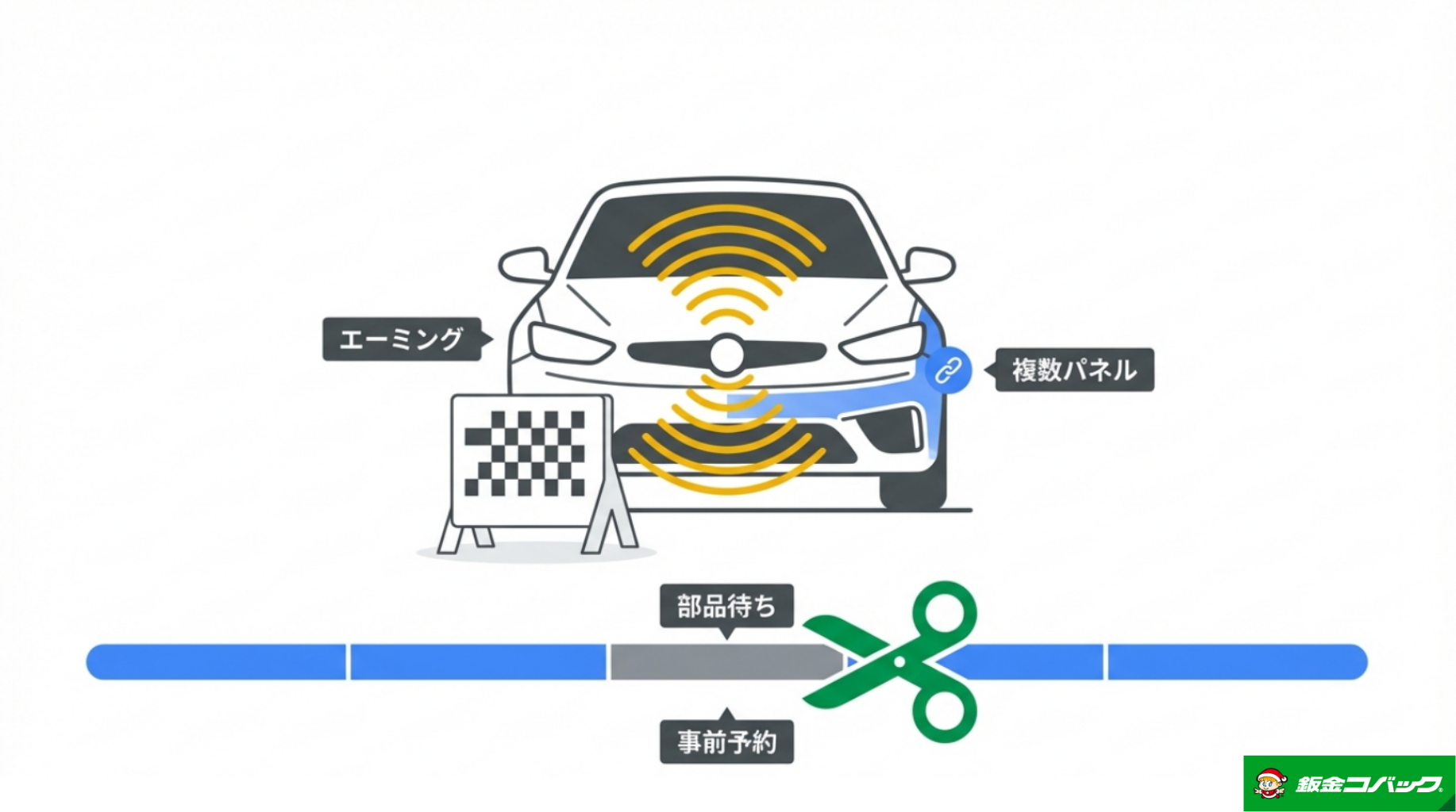 近年の自動車修理において、納期を左右する最も新しい要因が「エーミング(機能調整)」です。自動ブレーキや車線逸脱警報などの先進運転支援システム(ADAS)を正しく機能させるための校正作業ですが、これだけで修理期間が1〜2日延びるケースが標準化しつつあります。