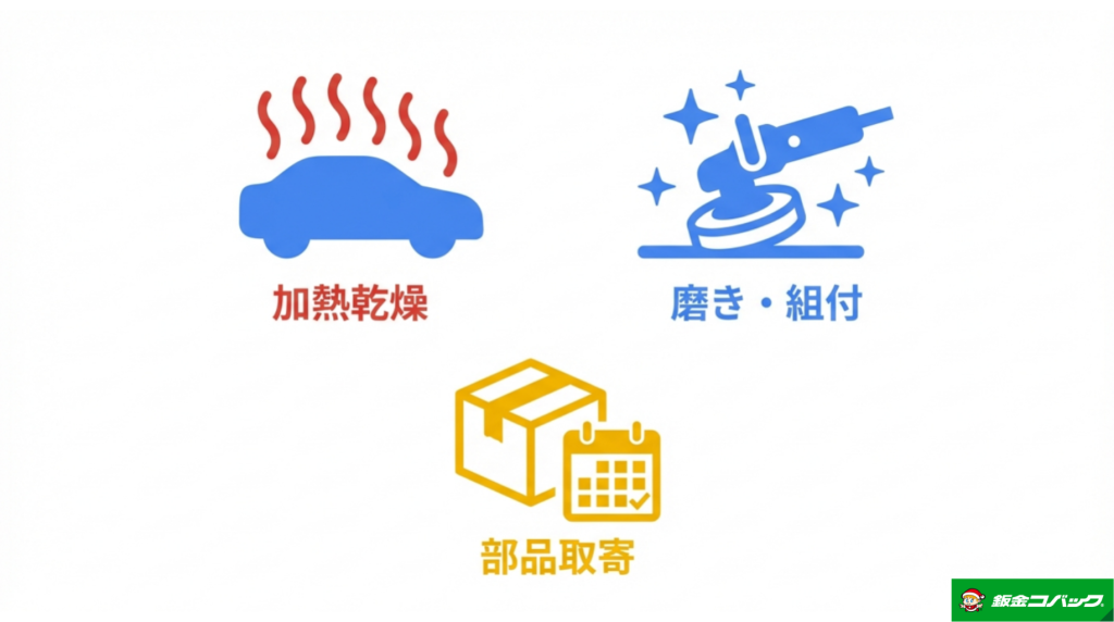 - 待ち時間の存在: 実際の作業時間以外にも、塗料の硬化を待つ時間や、部品が届くまでの「空白の時間」がどうしても発生します。