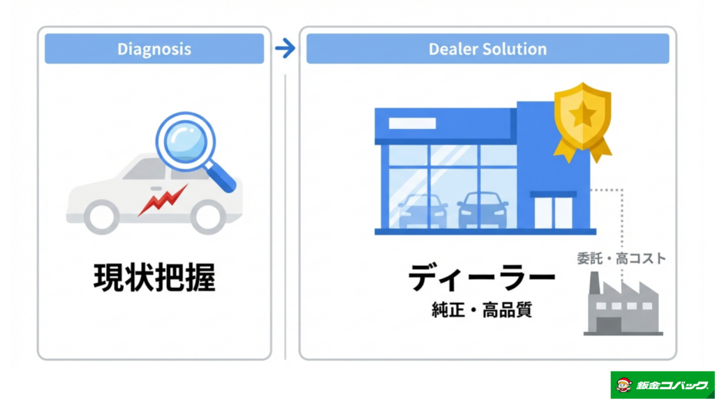 車の修理と聞いて真っ先に思い浮かぶのが、その車を購入したディーラーでしょう。ディーラーは特定のブランド(メーカー)の看板を背負っているため、サービス品質や信頼性は極めて高いと言えます。しかし、その分「費用が高い」というイメージも根強くあります。ここでは、ディーラーならではの修理の仕組みを深掘りします。