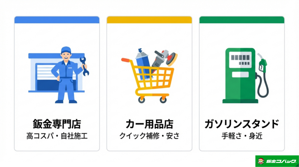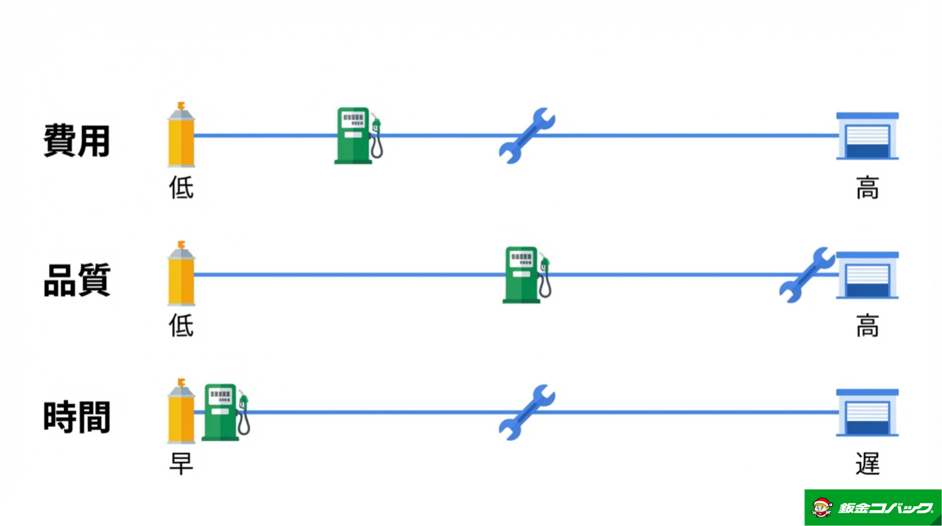 - ● パターンC:古い車で「サビさえ防げれば良い」「カー用品店」や「ガソリンスタンド」のクイック修理で十分です。最小限のコストで実用上の問題を解決できます。